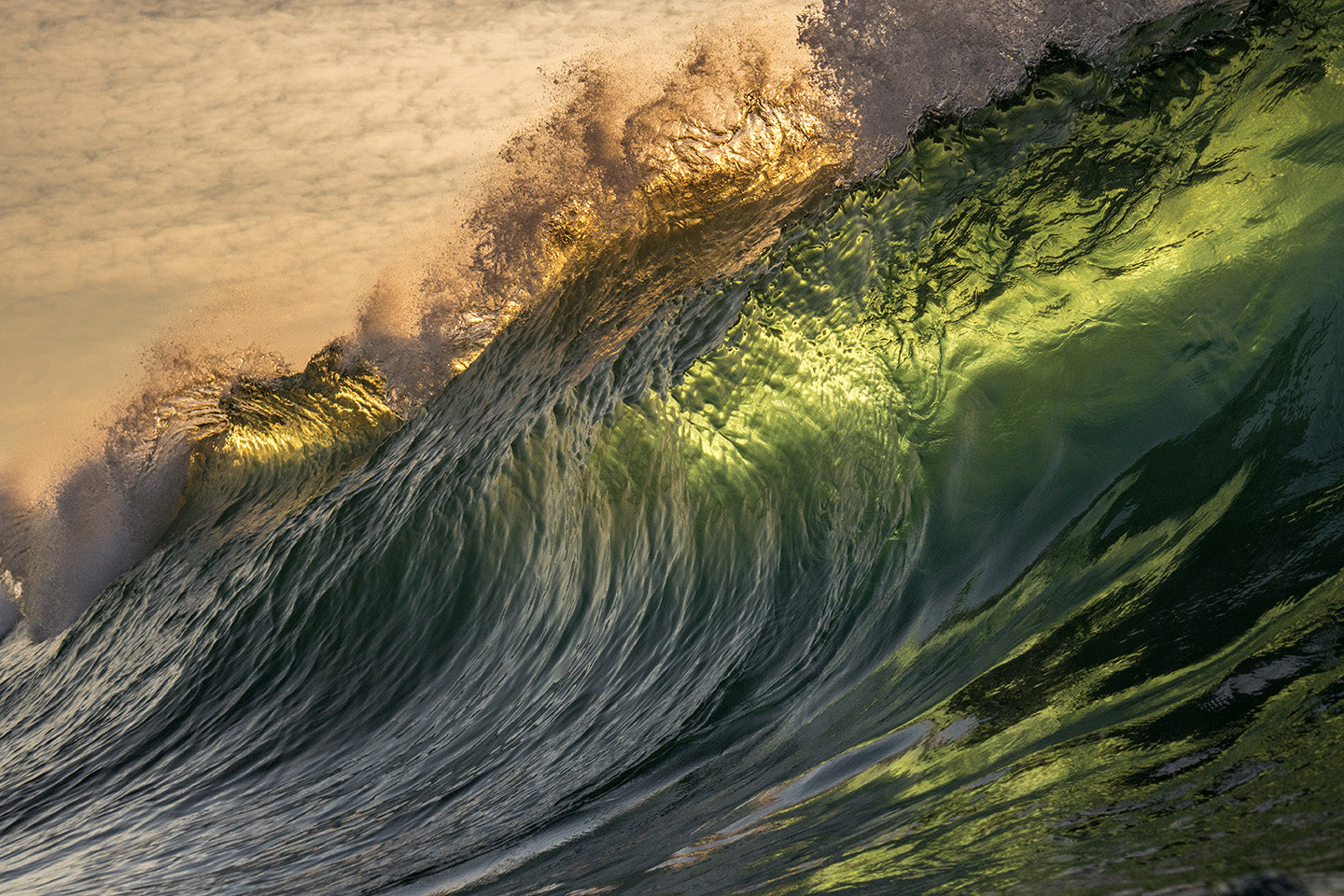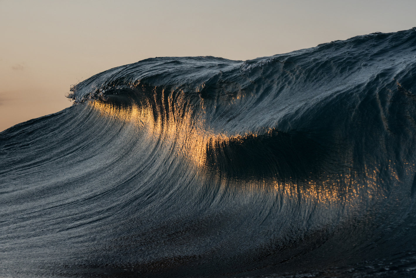 SICHTDurch die Bildung von Wellen über einem flachen Felsen oder einer Sandbank entstehen die Formen, die Sie beim Brechen an der Oberfläche sehen. Diese posierende Welle stand auf, als wüsste sie, dass sie fotografiert wurde. Es vermischt sich wunderbar mit dem Sonnenaufgang und den Reflexionen.