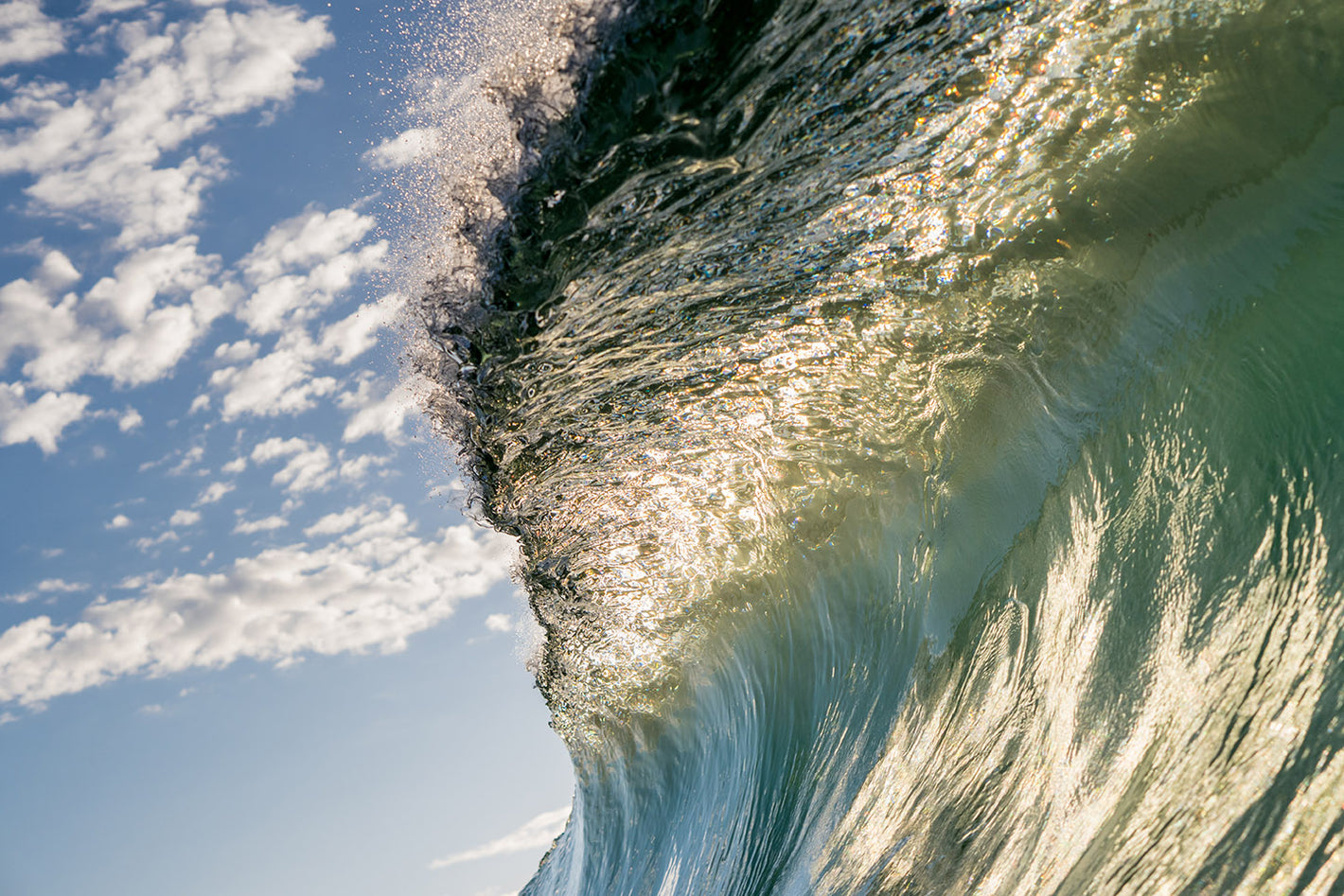 SICHTEin steil aufragendes Gewässer mit wunderschönen Kristallen, die am Rand der Welle schimmern, ergänzt durch blauen Himmel und bauschige weiße Wolken. Die Welle steht hoch, was ein kraftvolles Gefühl ausstrahlt.